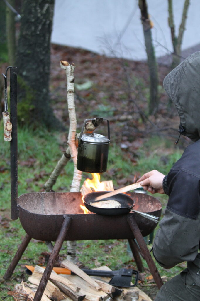 Je word wakker wanneer het licht door je tarp komt en de specht boven je begint te tikken, je staat op. Douw over het meer waar jij je water moet halen voor je koffie, samen filter en kook je het water en start je met het maken van een kampvuur. De avond daar voor hebben we het hout al gekloofd voor de volgende ochtend.